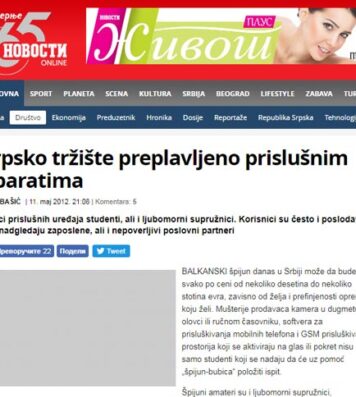 Ne računajući mobilne telefone, koji se takođe mogu zloupotrebiti u svrhu tajnog prisluškivanja i praćenja, danas je i u Srbiji moguće jednostavno i po prihvatljivim cenama nabaviti najmodernije prislušne uređaje za čije korišćenje nije potrebno gotovo nikakvo tehničko predznanje. Na sve veću upotrebu takvih uređaja i kod nas upućuju sve češće afere prisluškivanja i tajnog snimanja. Ako tome dodamo i činjenicu da se za uspešne špijunske akcije i nadzor nikad i ne sazna, dolazimo do zaključka da se na špijunažu mora ozbiljno računati i pre nego što se pojave jasni znakovi.