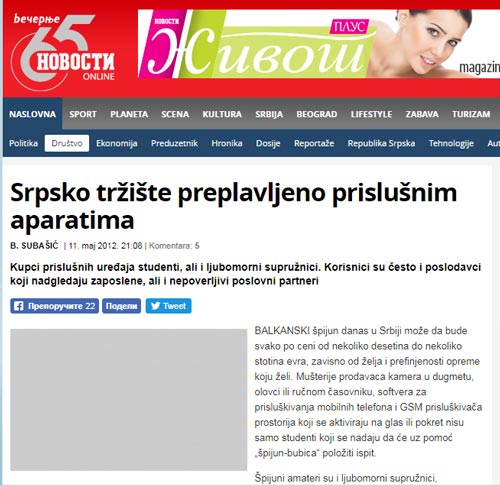 Ne računajući mobilne telefone, koji se takođe mogu zloupotrebiti u svrhu tajnog prisluškivanja i praćenja, danas je i u Srbiji moguće jednostavno i po prihvatljivim cenama nabaviti najmodernije prislušne uređaje za čije korišćenje nije potrebno gotovo nikakvo tehničko predznanje. Na sve veću upotrebu takvih uređaja i kod nas upućuju sve češće afere prisluškivanja i tajnog snimanja. Ako tome dodamo i činjenicu da se za uspešne špijunske akcije i nadzor nikad i ne sazna, dolazimo do zaključka da se na špijunažu mora ozbiljno računati i pre nego što se pojave jasni znakovi.